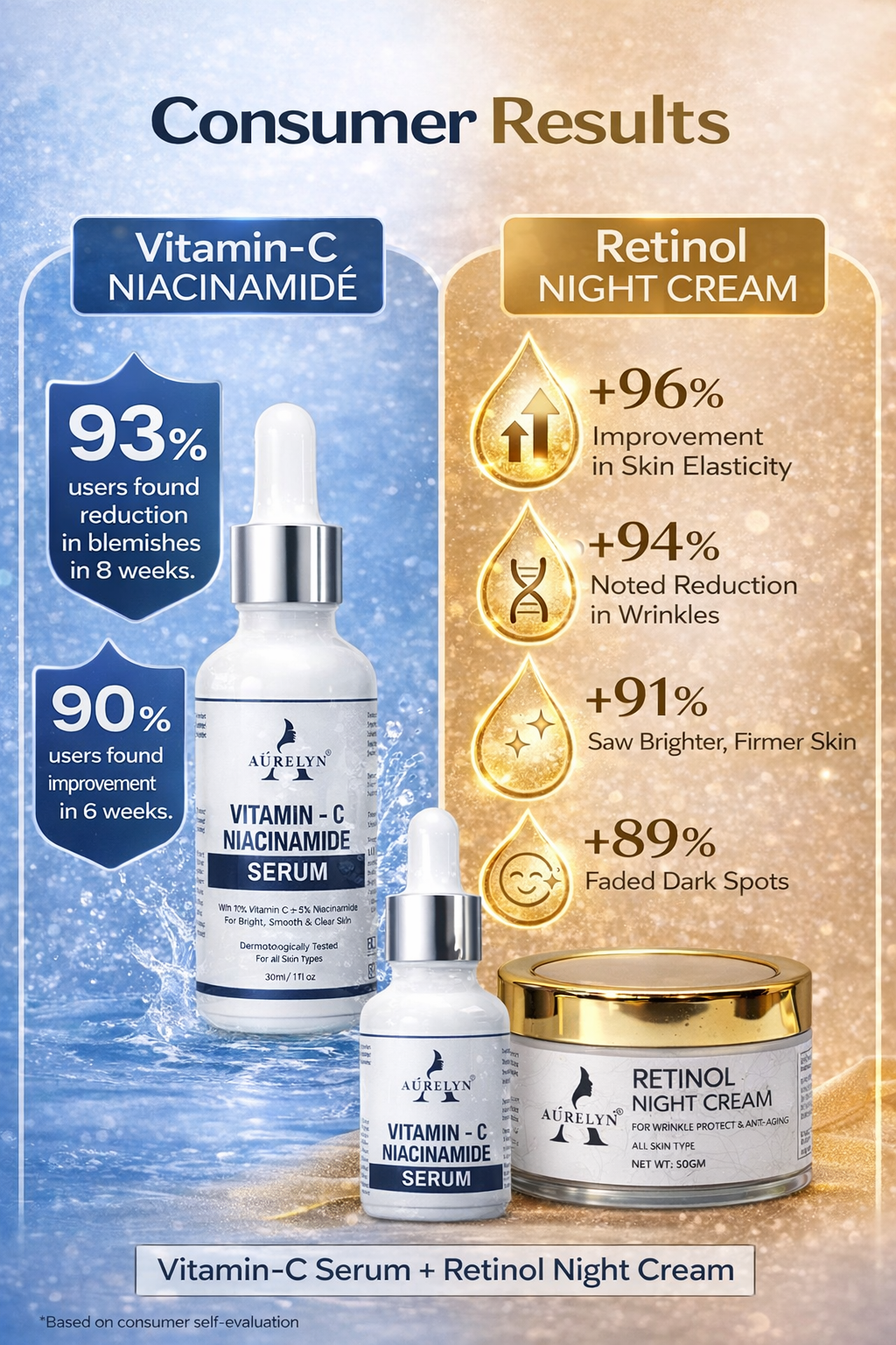This AÙRELYÑ skincare combo helps brighten, hydrate, and repair the skin for a healthier-looking glow. The Vitamin C + Niacinamide Serum supports brighter and even-tone skin during the day, while the Retinol Night Cream helps reduce fine lines and improves skin texture overnight. Together, they promote smooth, youthful, and well-nourished skin with consistent use.
